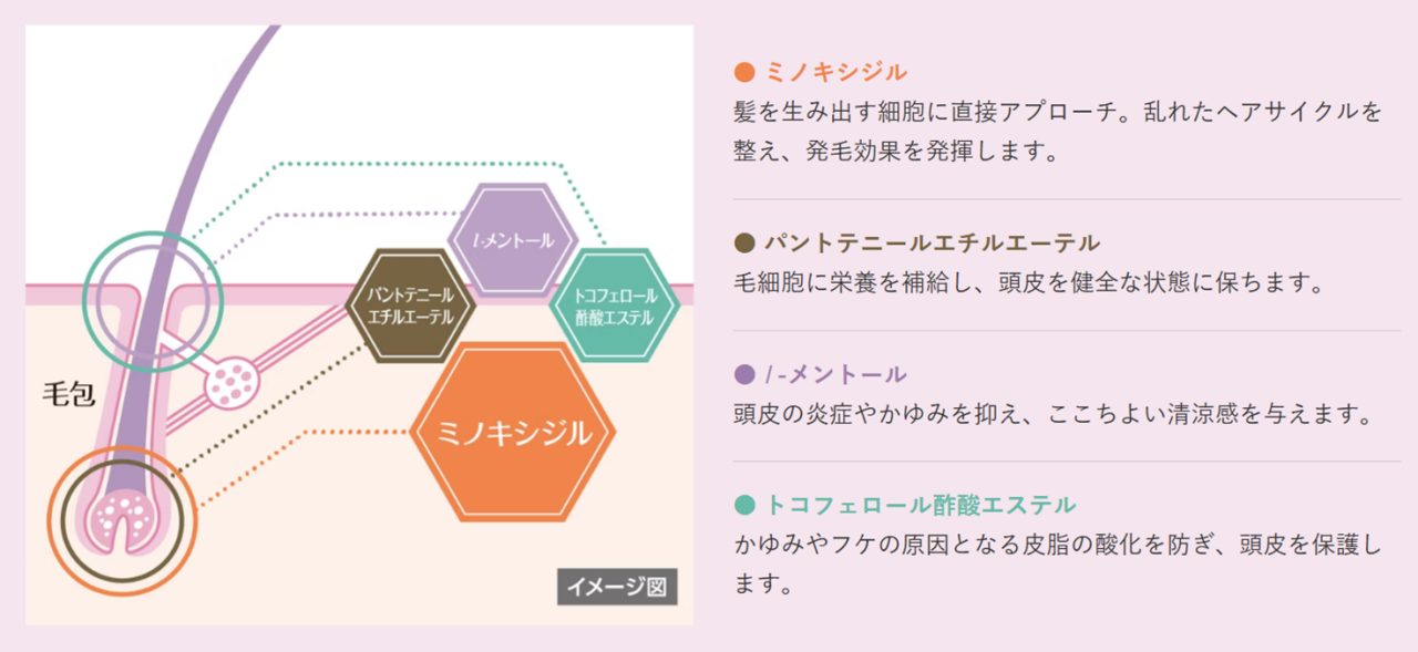 ●ミノキシジルに加え、頭皮の状態を整え、髪を生み出す力をサポートする3つの有効成分(パントテニールエチルエーテル、トコフェロール酢酸エステル、l-メントール)を配合しています。また、女性の頭皮への使用感を考えて、ヒアルロン酸Na(添加物:湿潤剤)も配合しています。