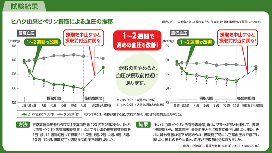本品にはヒハツ由来ピペリンが含まれています。ヒハツ由来ピペリンには、血圧が高めの方の血圧を改善し、正常な血圧を維持する機能があることが報告されています。